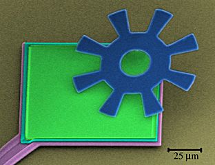 This whimsical image is a colorized Scanning Electron Micrograph (SEM) of mechanical gear which is smaller than a human hair. The gear was made polycrystalline silicon using surface micromachining techniques and is no longer attached to the substrate. However, the gear did eventually lodge onto an electrical bond pad (shown in green) due to surface forces. This image illustrates the extraordinary capability of MEMS technology to enable the realization of extremely small mechanical elements. This device was made through the MEMS and Nanotechnology Exchange fabrication network.